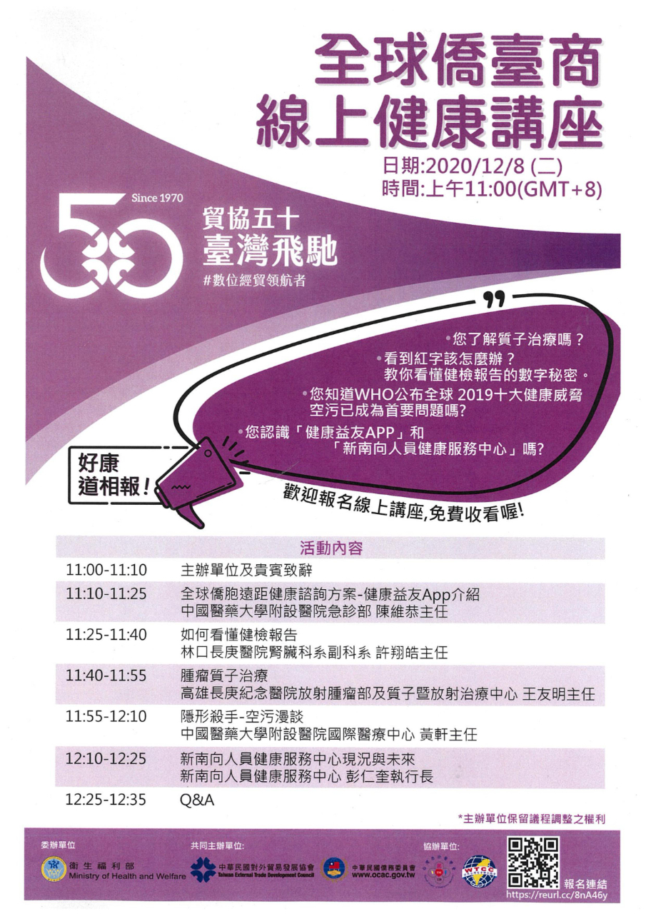 為關心疫情期間海外僑胞健康,僑務委員會與外貿協會訂於加東時間2020年12月7日晚間10:00(臺灣時間:中華民國109年12月8日星期二上午11:00)舉辦「全球僑臺商線上健康講座」直播說明會,內容包括「健康益友App介紹」、3場健康講座及新南向人員健康服務中心現況與未來,歡迎踴躍報名參加。