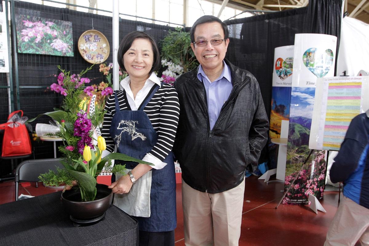 Ambassador Rong-chuan Wu, Representative of the Taipei Economic and Cultural Office in Canada, and Mrs. Wu showcase a flower arrangement.