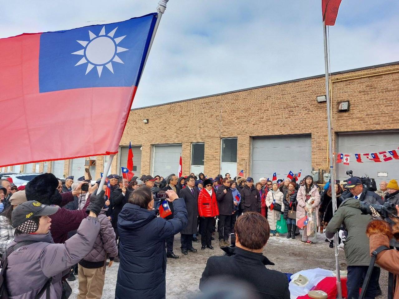 在華僑協會總會多倫多分會與安省中華總會館籌劃下,駐多倫多台北經濟文化辦事處處長梁毅鵬、安省議員Aris Babikian、僑教中心藍柏青主任及辦事處同仁,與上百位僑胞齊聚在兩國國歌聲中,迎接中華民國國旗冉冉升起。