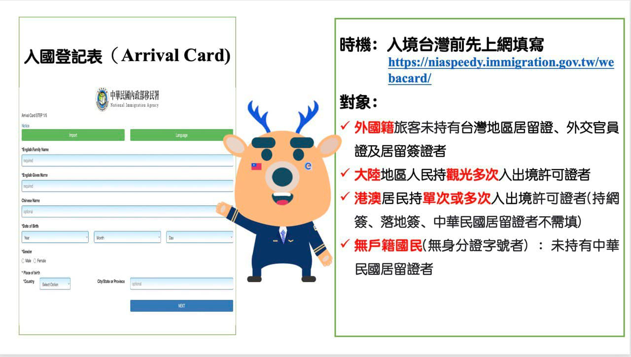 A reminder for international travelers entering Taiwan, please complete the Arrival Card online at https://niaspeedy.immigration.gov.tw/webacard/ before boarding your flight. Taiwanese nationals without household registration in Taiwan also have to fill out the online Arrival Card, which can expedite the airport customs clearance process!"