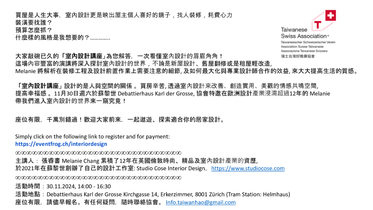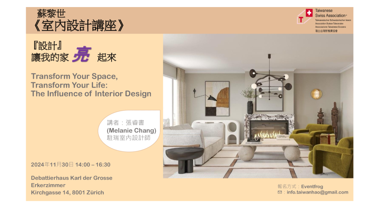 臺灣好協會室內設計講座 - 駐瑞士台北文化經濟代表團 Délégation culturelle et économique de Taipei ::: 跳到主要內容區塊