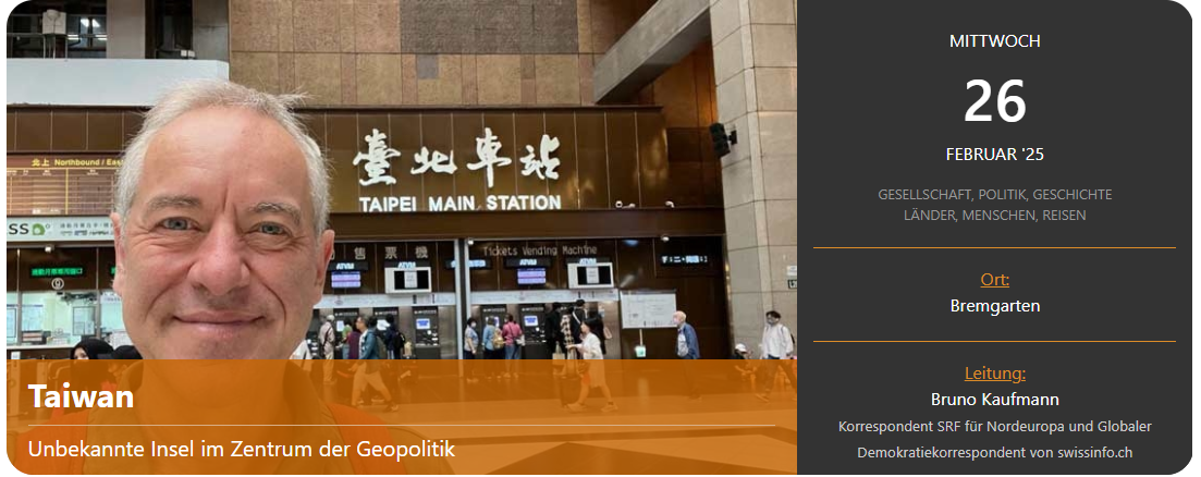 SRF-Korrespondent Bruno Kaufmann stellt Taiwan am 26. Februar 2025 in Bremgarten vor.