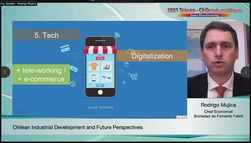 Taiwán desempeña un rol indispensable en la cadena industrial global de alta tecnología, mientras que Chile es el país más avanzado de América del Sur en industria y tecnología. La estructura industrial y económica entre Taiwán y Chile es diferente pero se complementan. Ambos países comprenden la importancia de mantener un desarrollo industrial sostenible frente al impacto de la pandemia. Por lo tanto, el 1er Foro de Desarrollo Industrial se enfoca en realizar intercambios técnicos y compartir experiencias relacionadas con la "Manufactura Inteligente". Los expertos panelistas de Taiwán, Sra. Kristy Hsu, investigadora asociada de Chung-Hua del Instituto de Investigación Económica y el Sr. Frank Hsieh, presidente de la Asociación de Manufactureros Eléctricos y Electrónicos de Taiwán y Kenmec Group, analizaron la tendencia de migración de la Cadena de Suministro Global, el nicho de cooperación de la industria de inteligencia de Taiwán y presentaron el actual estado y la implementación de la “Manufactura Inteligente” en Taiwán. Por parte de Chile, el Sr. Rodrigo Mujica, Jefe Economista de SOFOFA presentó el desarrollo industrial de Chile y la perspectiva de futuro. Además, el Phd Roy Lee, Senior Director Ejecutivo Adjunto de Chung-Hua del Instituto de Investigación Económica y el Sr. Manuel José Prieto, Director Internacional de SOFOFA, condujeron el diálogo de expertos industriales para explorar las oportunidades potenciales entre ambos países en la era pos-pandemia.