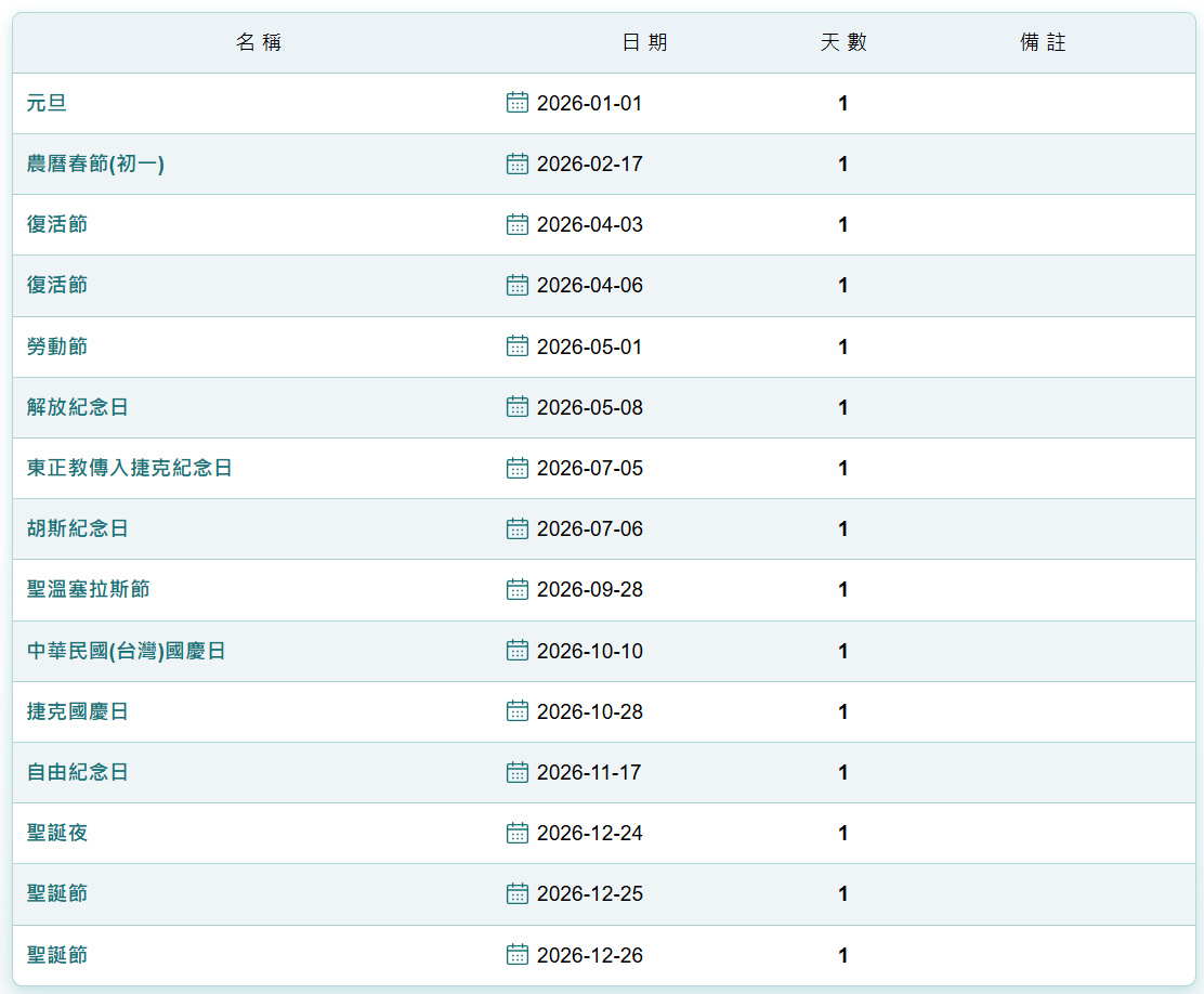 2026年本處將於以下日期休假乙日,不對外開放,當日領務櫃台也將暫停服務。