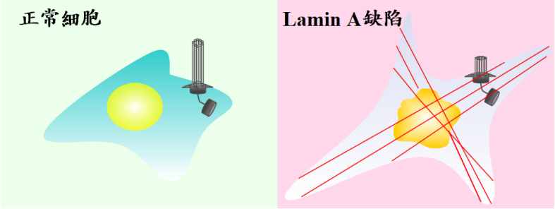 早衰症Hutchinson-Gilford progeria syndrome (HGPS)患者在嬰兒時期就開始出現發育不良、皮下脂肪變少、產生皺紋、禿頭、骨質疏鬆、心血管疾病及關節出現問題等,平均壽命只有13歲。這個疾病最早是在1886年被發現,直到2003年才知道是因LMNA基因突變所致,但是病理機轉至今仍不清楚。LMNA基因表現A型核纖層蛋白(lamin A),是構成核纖層(nuclear lamina)的主要成分之一,扮演著細胞核骨架的功能,當LMNA基因發生突變,細胞核會出現不正常的皺摺現象,甚至凹陷變形。除了早衰症之外,LMNA基因突變也與其他至少10種人類疾病有關,例如 Emery-Dreifuss肌肉萎縮症(muscular dystrophy)、擴張型心肌病變(dilated cardiomyopathy)等,這些疾病統稱為核纖層蛋白病症(laminopathy)。