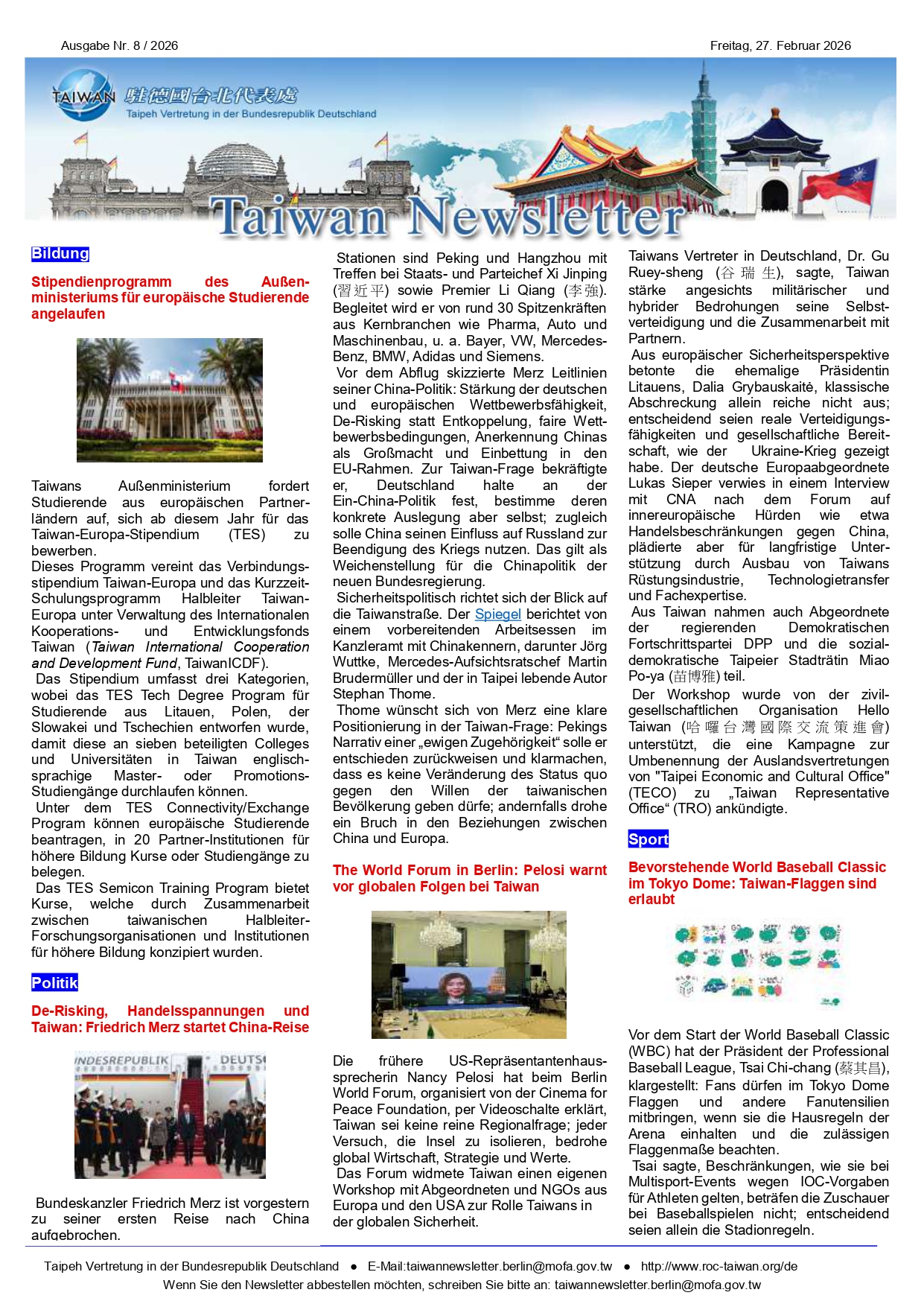 Taiwan Newsletter 2026.02.27 - Taipeh Vertretung in der Bundesrepublik Deutschland 駐德國台北代表處 :::