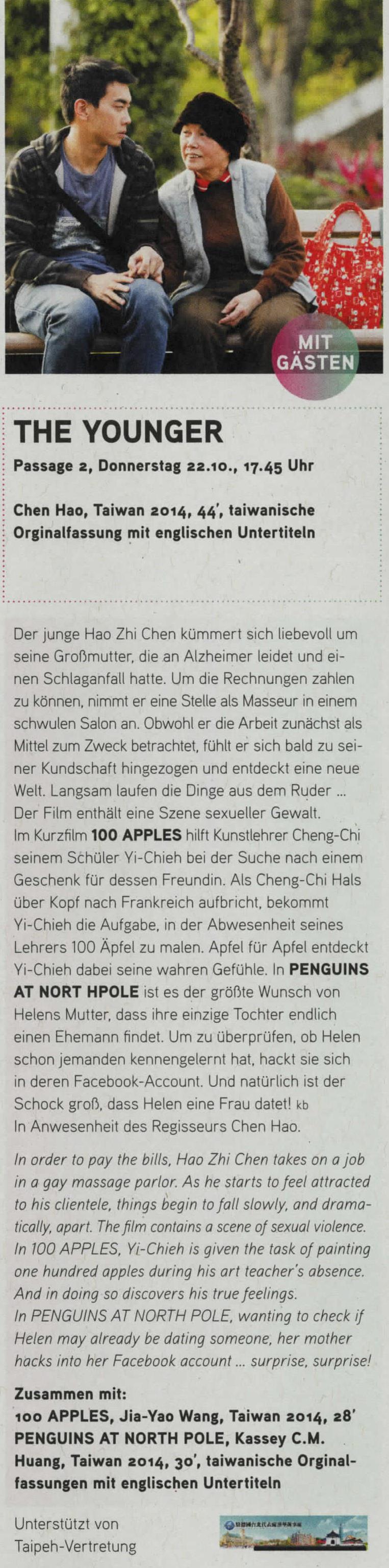 「青親」、「蘋果男孩」及「海倫她媽」3部臺灣電影應邀參加德國「漢堡第26屆國際酷兒影展」(26. Lesbisch Schwule Filmtage Hamburg International Queer Film Festival),歡迎關心全球多元性別議題者屆時前往觀賞! 日期:2015年10月22日(星期四) 17:45地點: Kino Passage 2 Möckebergstrasse 17 20095 Hamburg詳情請上網參閱http://www.lsf-hamburg.de《青親》The Younger陳彥宏 陳壕/2014/Color/44min /輔導級文化部第37屆金穗獎學生作品類最佳劇情片獎《蘋果男孩》100 Apples王嘉耀/2014/Color/28min《海倫她媽》Penguins at North Pole黃靖閔/2014/Color/30min