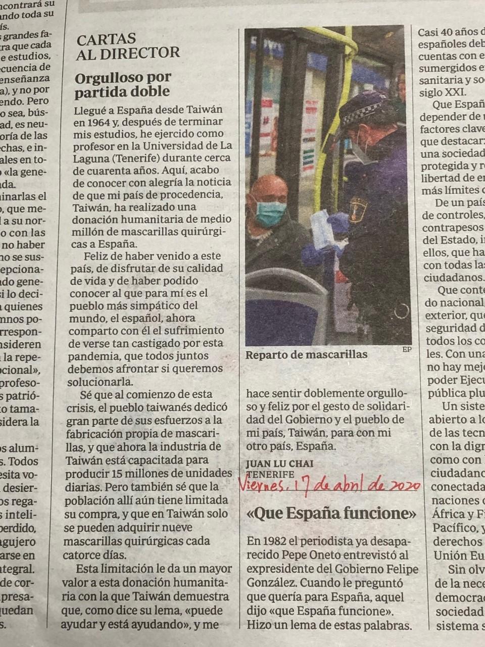 西班牙主流媒體「ABC日報」於4月17日刊登僑務諮詢委員陸錦林以「雙倍驕傲」為題的投書略以,