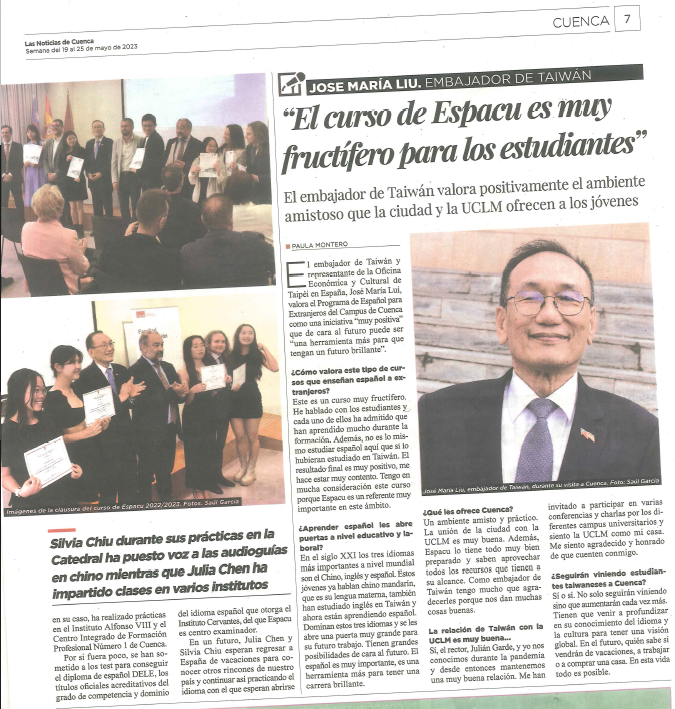 西班牙地方主流媒體「昆卡新聞」(Noticias de Cuenca)於最新發行的5月19日至26日週報以「西語課程計畫對學生而言成果豐碩」為題,刊出駐西班牙代表處劉大使德立的專訪報導: