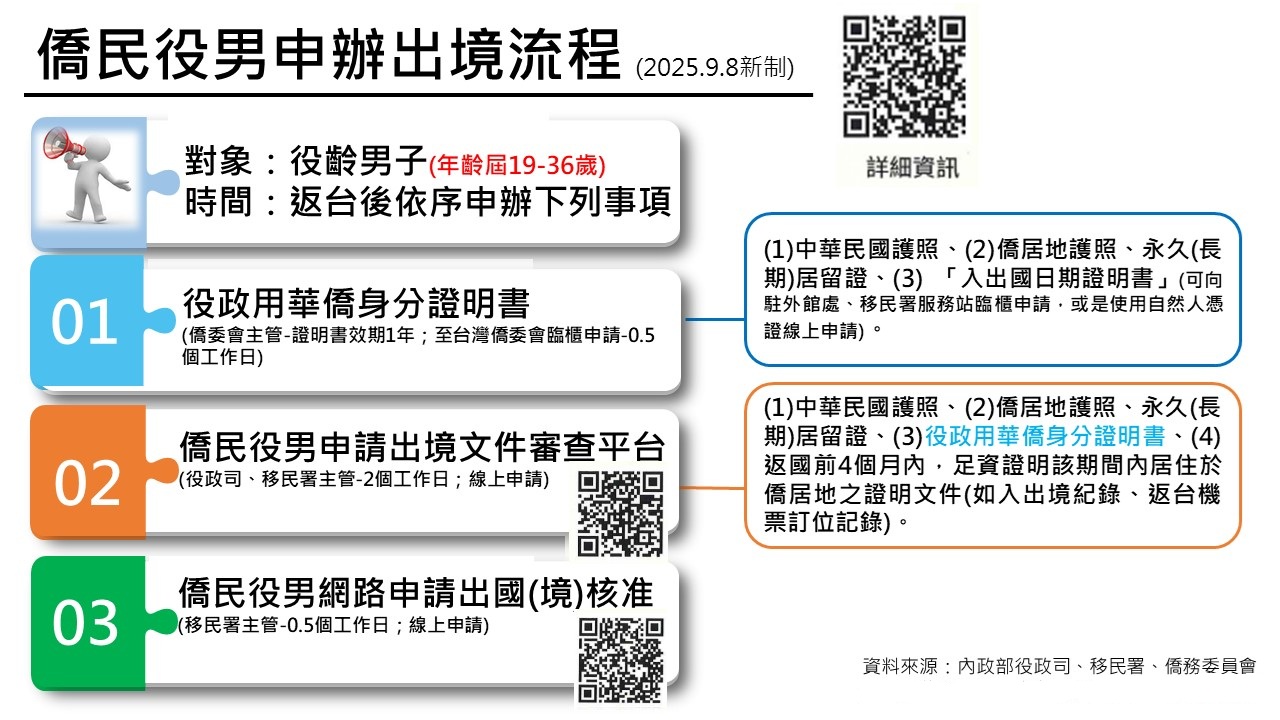 從114年9月8日開始,因內政部修正「歸化我國國籍者及歸國僑民服役辦法」,住在國外的僑民役男,回臺再出境需要先向僑務委員會申請一張「役政用華僑身分證明書」(效期自核發日起1年),再到移民署網站申請出境審查和核准。護照內頁的「僑居身分加簽」章將不能算是證明僑民役男身分的依據。