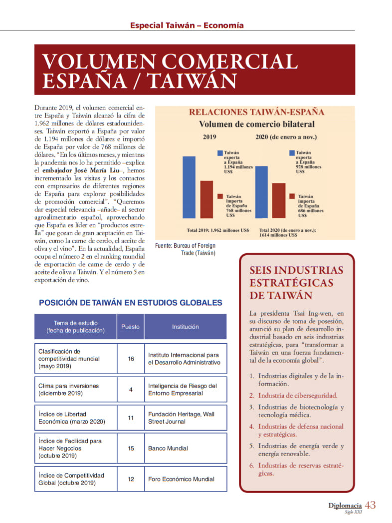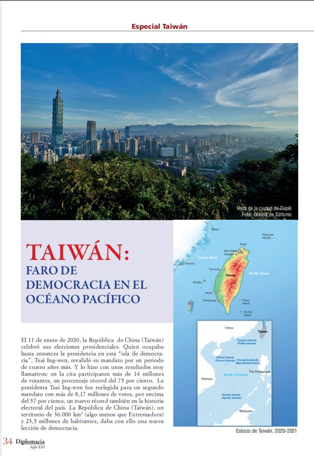 La prestigiosa revista Diplomacia, que edita la Academia de la Diplomacia, publica en su último número un reportaje especial a Taiwán, país al que presenta como ”Faro de democracia en el Océano Pacífico”. El amplio reportaje dedica sus doce páginas a diferentes asuntos relacionados con Taiwán: el discurso de la presidenta Tsai Ing-wen y del embajador José María Liu para el Día Nacional de Taiwán, el éxito de la isla frente a la pandemia de la covid-19, el lugar que Taiwán merece en la comunidad internacional, las opiniones del embajador José María Liu sobre temas de la actualidad de Taiwán, la fortaleza de la economía de Taiwán, Taiwán como destino de turismo seguro y las relaciones comerciales y culturales con España.