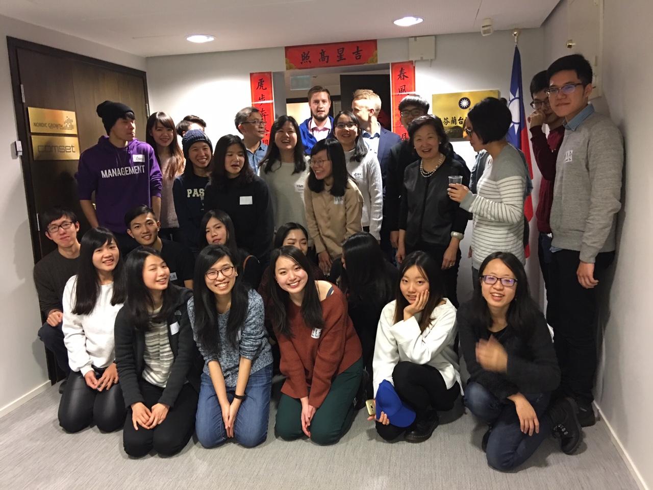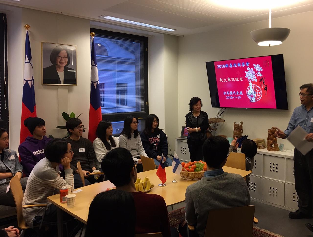 為傳達政府對旅芬蘭台灣留學生關懷之意,並為其就學期間提供生活安全便利資訊,駐芬蘭代表處於本(107)年1月19日下午於代表處舉辦賀新春迎新生茶會聯絡情誼,並邀請芬蘭Nordea銀行派員前來講解同學初抵芬蘭生活關切之銀行開戶事宜,計有來自芬蘭各地近30名留學生參加。駐芬蘭代表處洋溢一片歡慶氣氛,在戶外零下溫度環境中,為我留學生心中注入暖流。