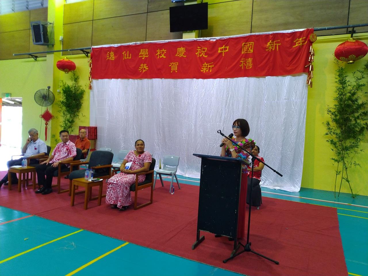 本年2月4日斐濟蘇瓦市逸仙小學在體育館舉辦慶祝農曆新年表演活動,斐濟華人教育協 會袁主席志光(Newton Yuen)偕理事多人歡迎中華民國駐斐濟代表處黎代表倩儀蒞校。黎代表致詞說明,中華民國(臺灣)除保存歷史悠久之中華文化藝術精品,亦保有中華文化傳統精隨,遵循許多傳統習俗,黎代表並一一說明除夕圍爐、貼春聯、放炮竹驅年獸、初二嫁女回娘家、初五拜財神、十五吃元宵賞花燈之年節習俗,並當場進行農曆春節習俗有獎搶答,引起近700位師生熱烈迴響。