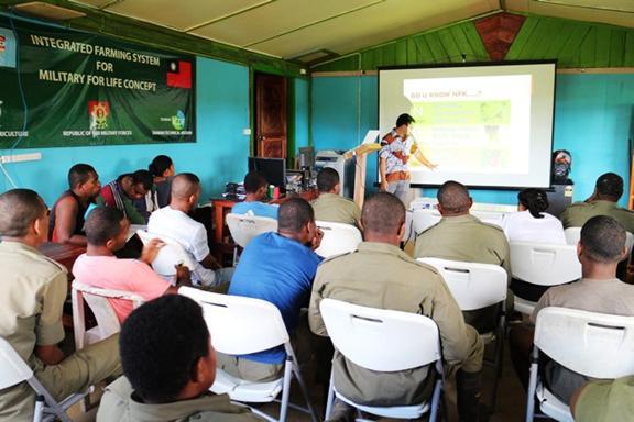 Taiwan Technical Mission specialist Mr. Chen, Shih-Kuan made a presentation at the Republic of Fiji Military Force Veterans' Farm, introducing basic agricultural skills.