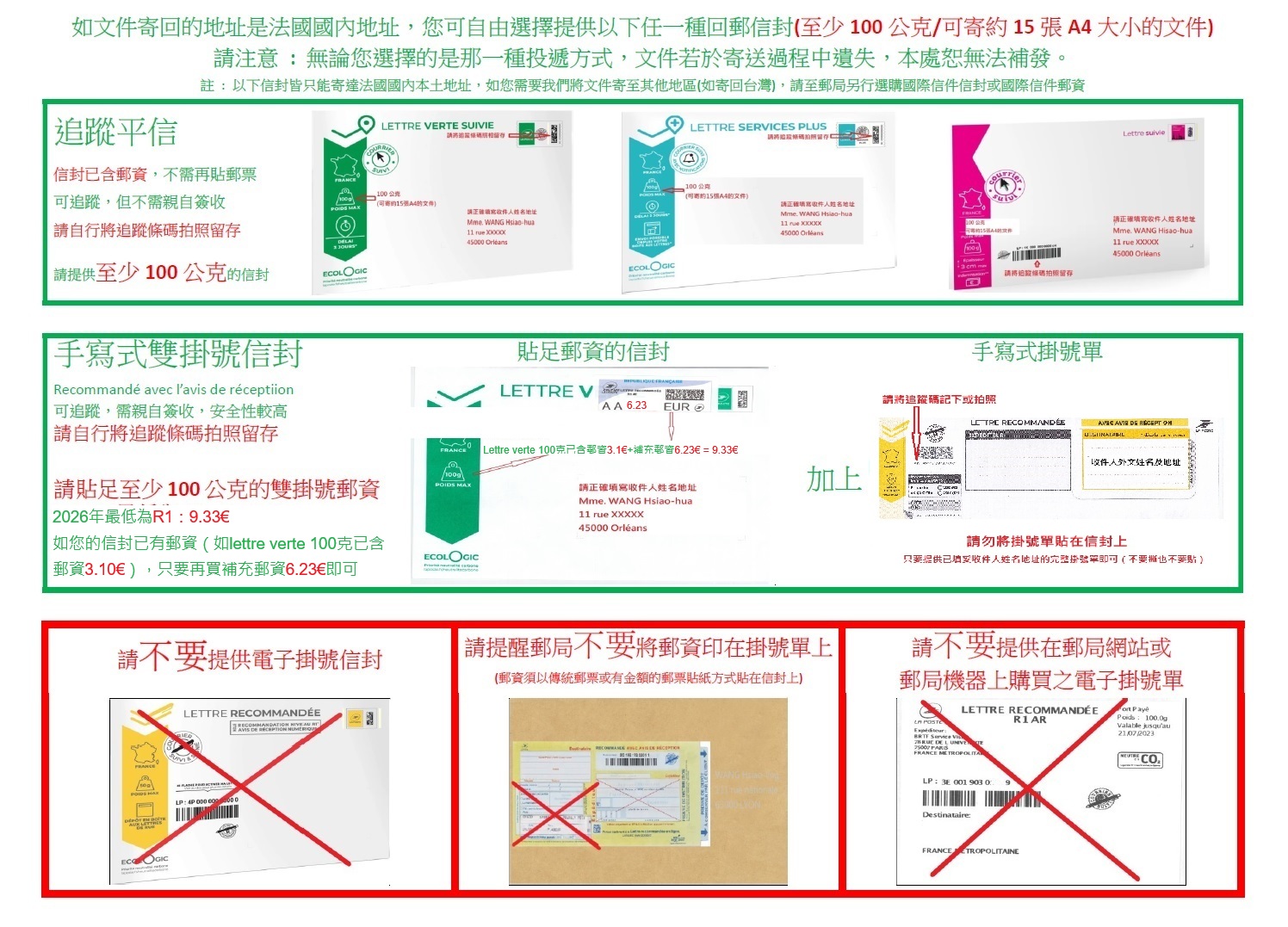 提醒您:因您所郵寄之文件包含正本及其他個資文件(如護照影本...),為確保郵寄安全,請您避免以平信郵寄。請選擇安全性較高之「單掛號」(recommandé sans avis de réception)或「雙掛號」(recommandé avec avis de réception A/R)寄給我們。或至少使用具有追蹤功能的Lettre suivie。並請您清晰地書寫您本人(寄件人expéditeur)的姓名地址,以供萬一無法投遞時,郵局能將文件退回給您。
