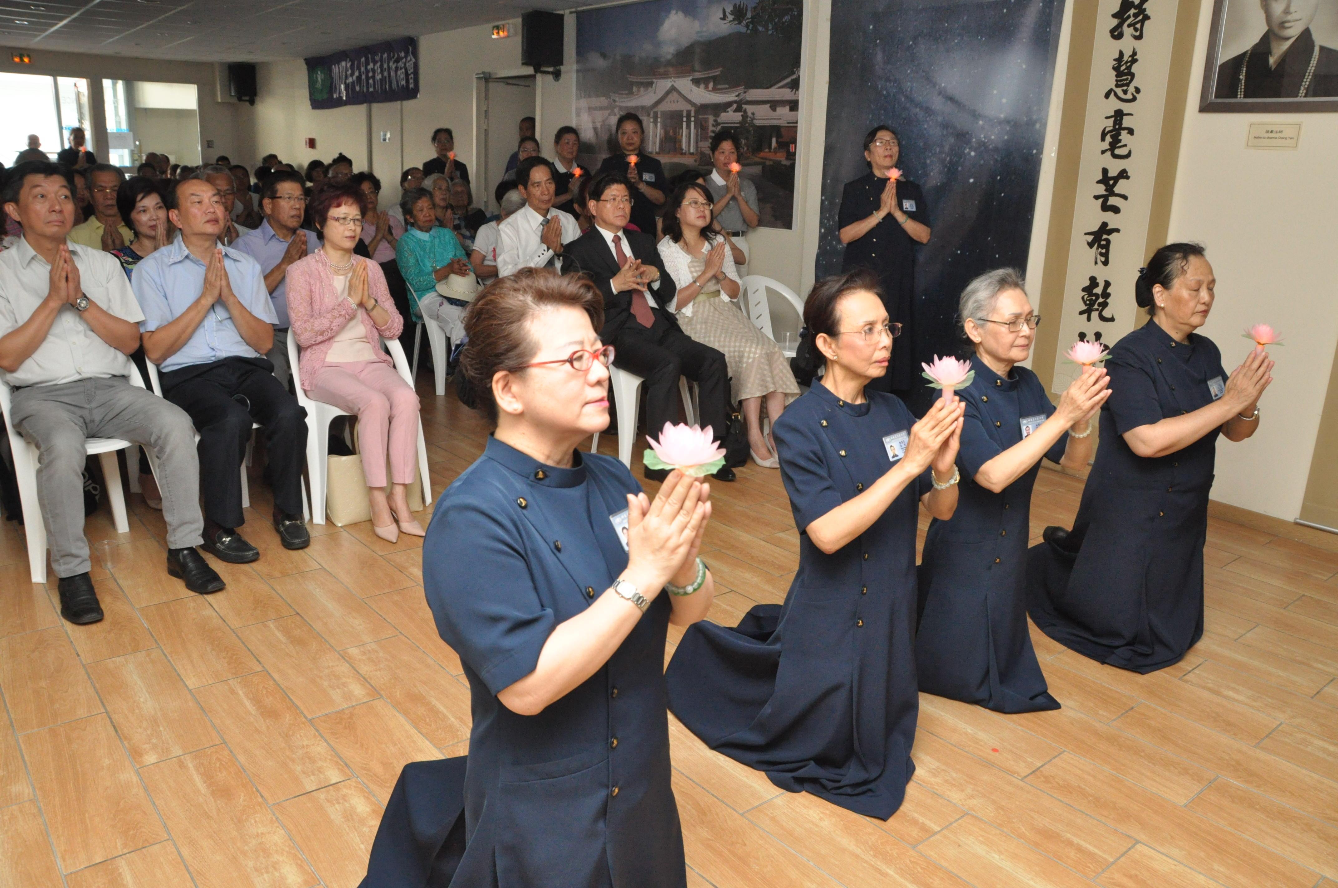 慈濟基金會法國聯絡處於8月27日下午2時在巴黎13區會所舉辦2017年「七月吉祥感恩祈福會」;中華民國駐法國代表張銘忠大使夫婦偕同僑務組林宏穎組長應邀出席致意,和陳秫娟、黎輝、林奇雋、李永慶、曾金華、郭珮涵、劉作鑫、丘世璿、鄭蓓斐、蕭梅杏、蔡家志等僑務榮譽職人員及160餘位僑胞及信眾一起誠心齋戒,用智慧、正信解救眾生倒懸之苦,並祈福社會平和。 儀式由慈濟師兄姊帶動唱「歡迎歌」歡喜迎賓揭開序幕。負責人黃行德僑務諮詢委員旋即代表致詞感謝各界嘉賓熱情參與慈濟活動,說明農曆七月正是佛陀的「歡喜、吉祥、孝親月」,舉辦本次祈福會的目的即希望人人抱持智慧、正信的生活態度,以清淨、齋戒來表達虔誠,弘揚七月孝親月,感謝父母恩。此外,亦指出慈濟於2015年巴黎舉行之第 21 屆聯合國氣候高峰會(COP21)中提議共知、共識、共行推動茹素,而本年另一個活動主題是響應推動「111世界蔬醒日」,環保、減碳,救地球,敦請大家一起虔誠祈求人心淨化,社會祥和,天下無災無難。 張銘忠嗣於致詞時指出:「全球暖化,氣候變遷」是一個確定而非常具體的事實;法國雖無重大自然災害,但近二年來因為恐攻的關係,也造成民眾在聚會時必須隨時提高警覺;駐法國代表處將持續為大家提供24小時急難救助服務。此外,亦特別提及最近僑界發起成立關懷救助協會,希望兩者相輔相成,能進一步提供對僑界、旅外國人、度假打工青年及留學生的關懷與照顧,並在急難發生時於第一時間提供必要之協助;期勉未來能在法國較大的城市成立幾個聯絡點,由代表處正式委託當地熱心僑胞或留學生擔任聯絡人,擴大相關聯繫服務。 簡單儀節暫告段落後,花道暨茶道表演、慈青「布施的意義」分享、手語演繹等節目亦配合證嚴法師「七月本是吉祥月」及「人間菩提」開示VCR穿插陸續展開。最後,慈濟基金會法國聯絡處即以「供燈果花」儀式禮敬諸佛,為與會者祈福,並在眾人齊唱「祈禱」的悠揚歌聲中,功德圓滿。主辦單位援例為與會鄉親精心準備豐盛茶點,張銘忠夫婦亦全程和大家彼此閒話家常,親切互動,氣氛和樂溫馨。