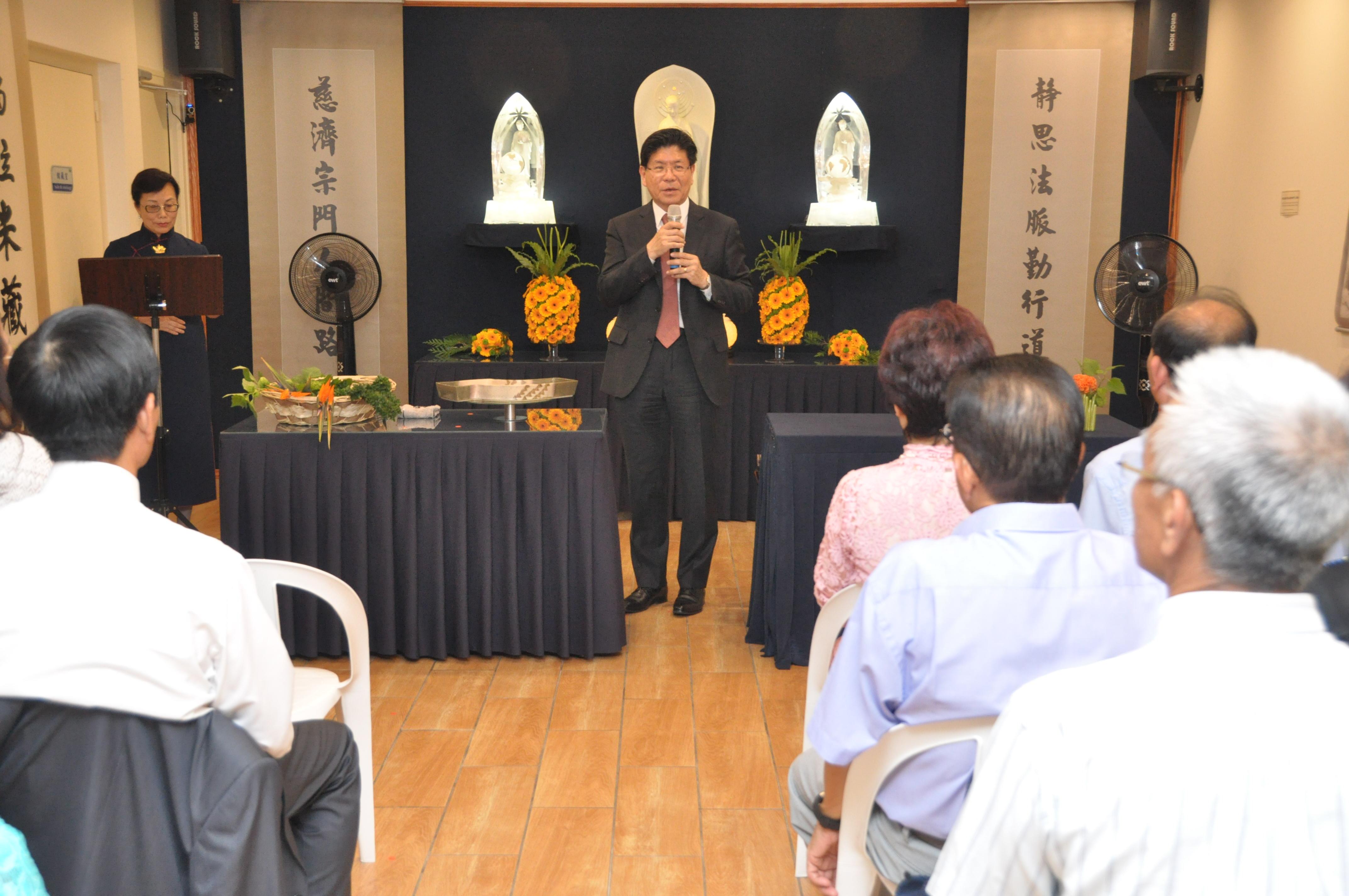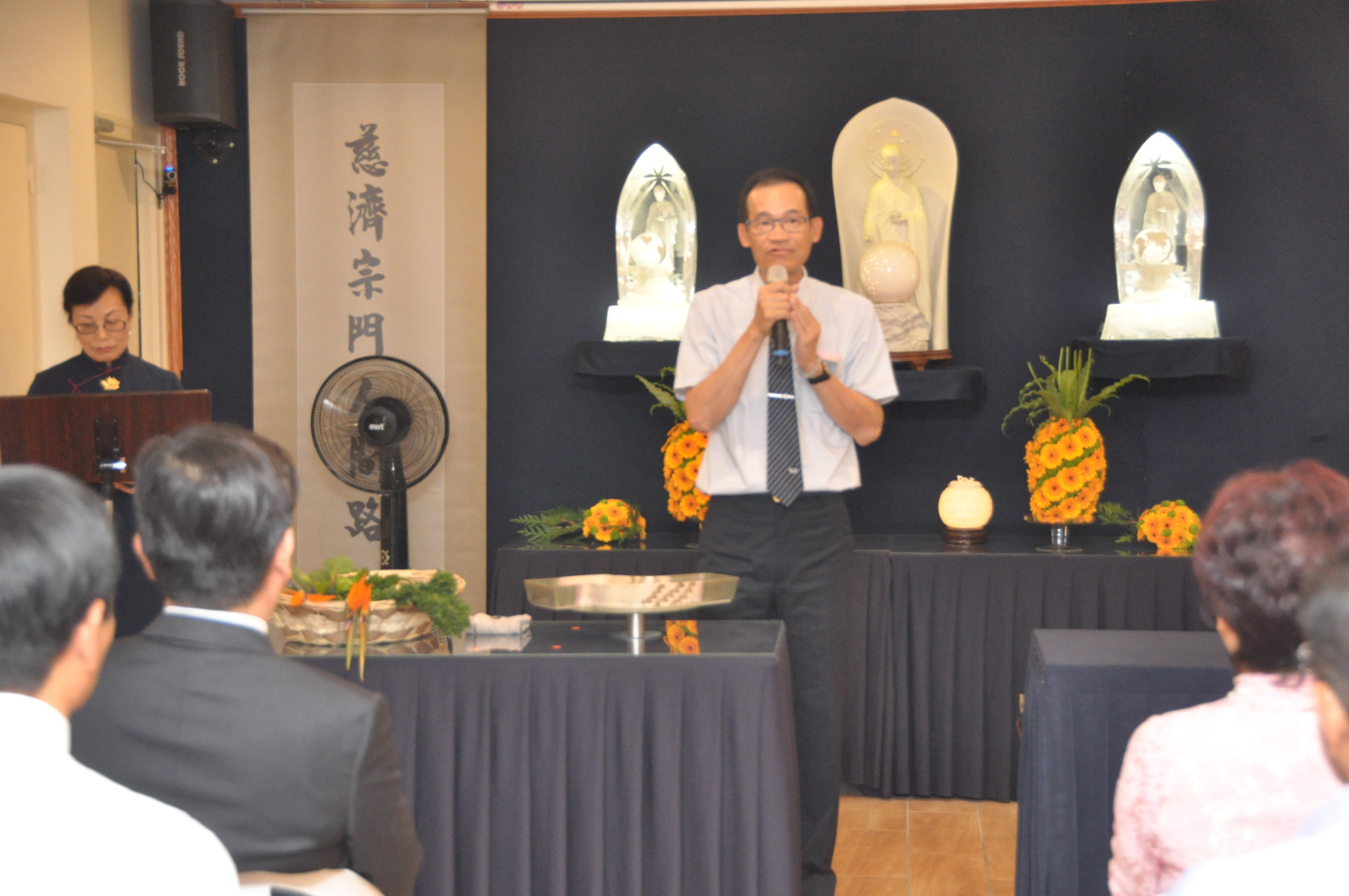 黃行德負責人致詞張銘忠大使致詞「供燈果花」儀式 張大使夫婦和與會僑領合影