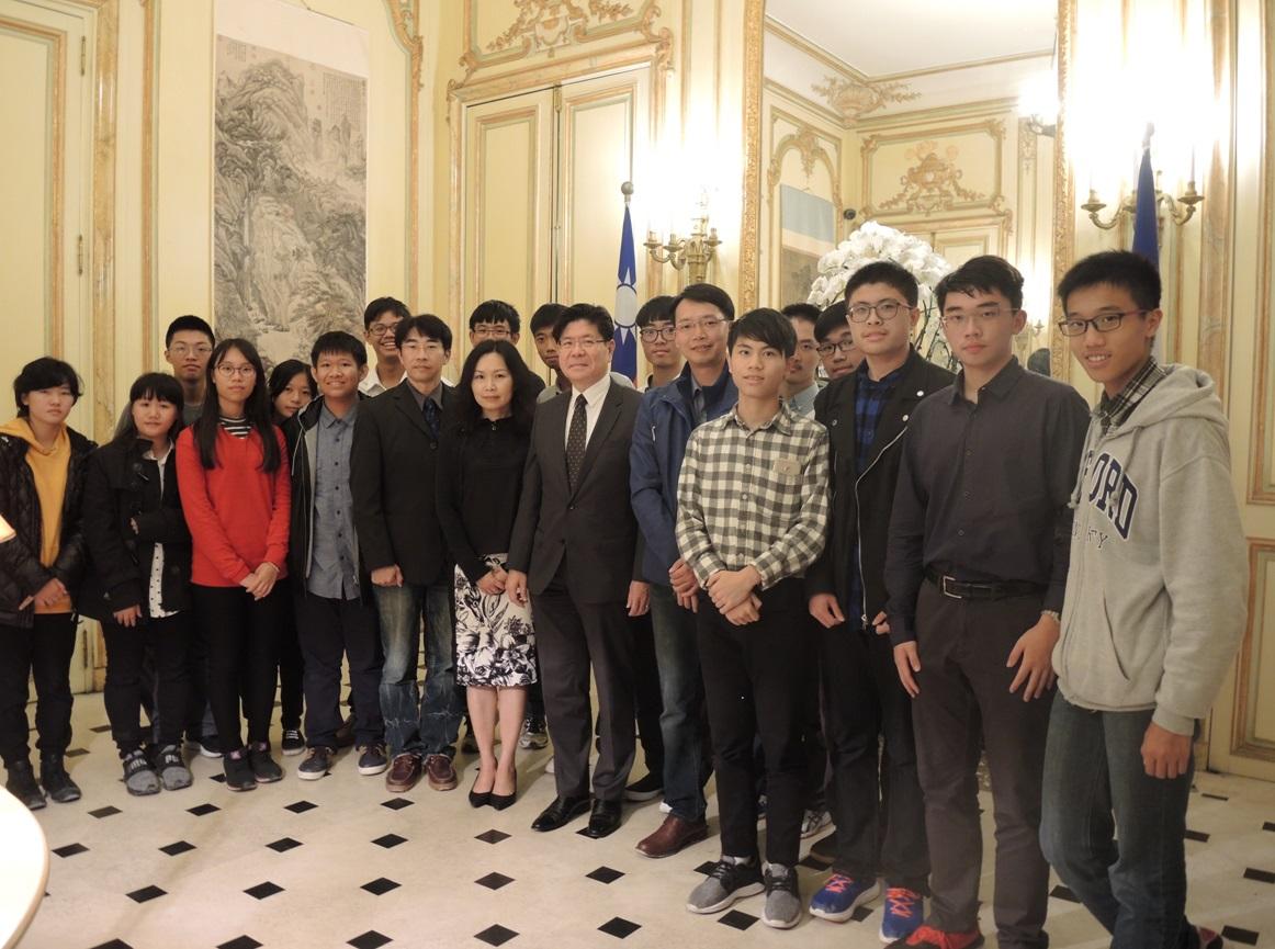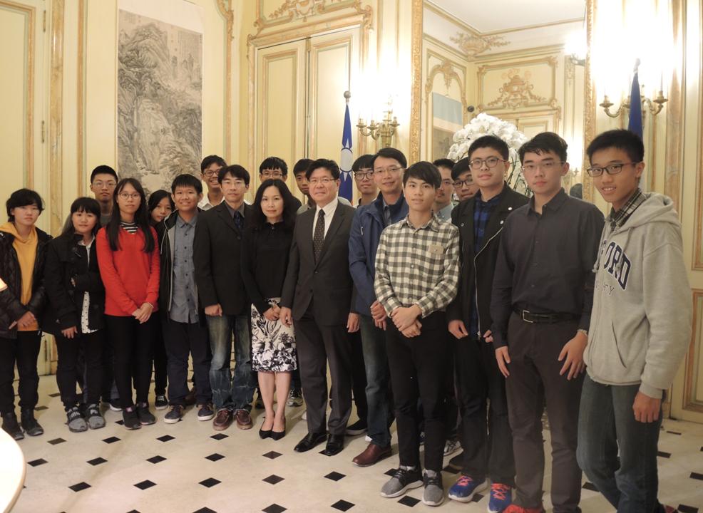 國立臺中第一高級中學學務主任黃偉立、訓育組長劉殊賢於10月24日18:00率30名學生到本處訪問,張大使接待全團並勉勵學生增進國際視野、培養語言能力及專業領域專長。