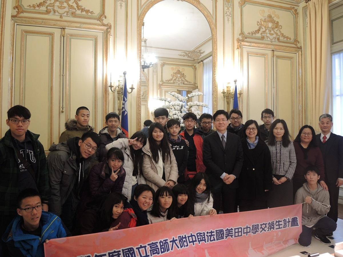 駐法國代表處張銘忠大使於2月6日全程接待國立高雄師範大學附屬高級中學李金鴦校長及師生一行24人,並勉勵學生充實自我、培養能力與自信。國立高雄師範大學附屬高級中學自2013年起與法國里爾市(Lille)美田高中(Lycée Polyvalent Beaupré d'Haubourdin)開始學生互訪計畫,並於2016年簽訂兩校姊妹校合約。今年該校由李金鴛校長領隊,偕同圖書館主任向志豪先生、主任教官葉憶蓉女士及教師程偉嘉先生等率20名學生等共24人於1月30日抵達里爾市進行交流,續於2月7日抵巴黎,並於同日11時至本處拜會張銘忠大使。張大使首先談及法國得以為世界翹楚,乃基於全方位發展的遠見與政策;他並基於自身駐外經驗,勉勵同學開闊心胸,加強中文與外語能力、充實專長以及多方面的知能,以豐富內涵並培養自信。李校長感謝大使的接待,表示校方希望能基於目前與美田高中成功的基礎之上,更進一步與其他法國中學進行交流。教育組陸美珍組讚許高師大附中與法國6年交流的投入與成功實例,期許學生擔任雙向交流的青年大使,她也介紹了臺法各級教育合作現況與趨勢,並表示將盡力推動該校未來與法國其他學校的深度交流。