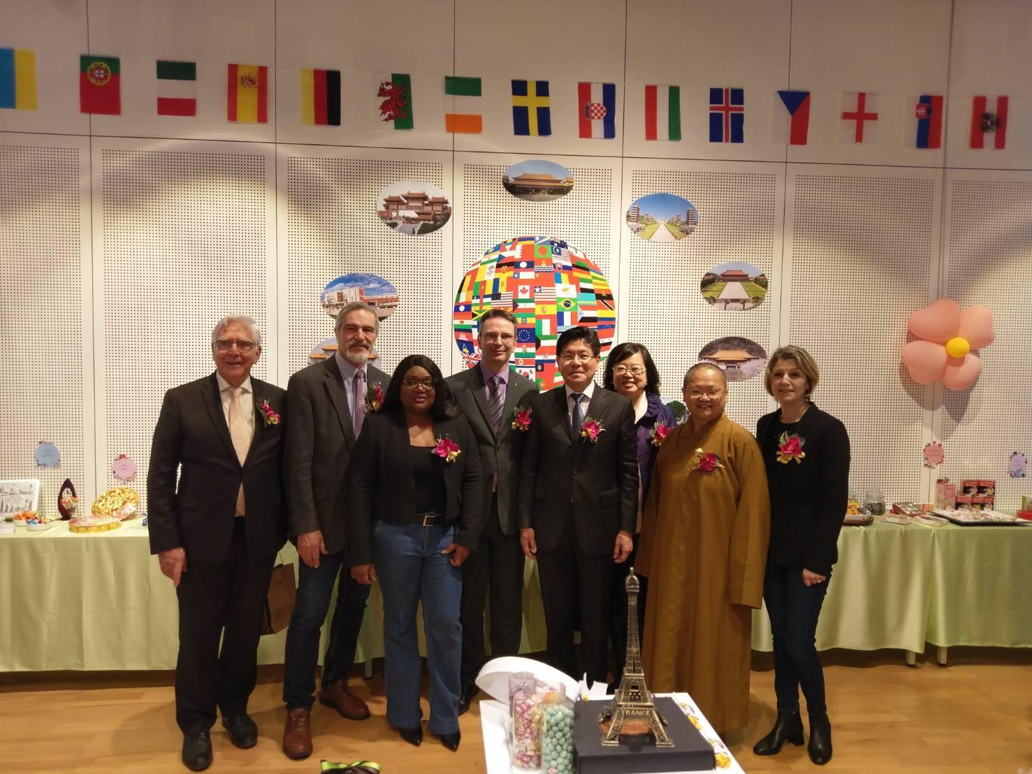 法國佛光山法華禪寺於3月4日舉辦「2018年忠義傳家梵音樂舞慶元宵活動」;張銘忠大使夫婦偕僑務組林宏穎組長參加,和碧西(Bussy Saint-Georges)市政府官員及近300位各界信眾與法國友人一同歡慶元宵。