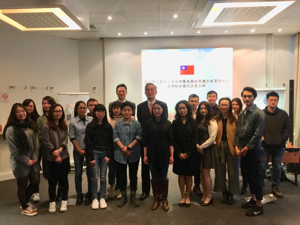 駐法國代表處吳志中大使於4月5日(星期五)偕科技組及教育組赴法國南部大城里昂(Lyon)舉辦「里昂學人與吳大使有約暨我國政府攬才政策說明會」,並於會上以「臺灣的外交戰略與國家生存」發表專題演說。