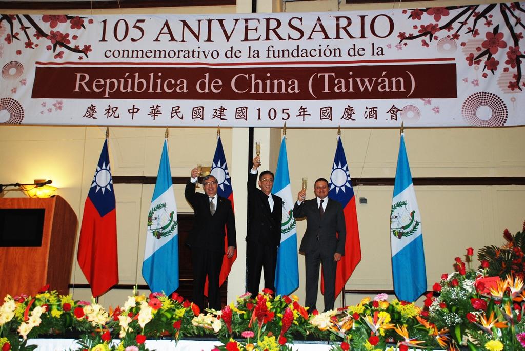 中華民國駐瓜地馬拉大使賴建中於105年10月7日中午在瓜京皇道旅館主持國慶酒會,瓜國第一夫人Patricia de Morales、副總統Jafeth Cabrera、外交部長Carlos Raúl Morales、次長Carlos Ramiro Martínez、國會議長Mario Taracena、最高法院新任院長Silvia Patricia Valdés、重要部會首長、駐瓜外交團團長教廷、宏都拉斯、尼加拉瓜、土耳其、哥斯大黎加等國駐瓜大使、各界友人、僑胞共500餘人蒞臨同賀。 賴大使在Cabrera副總統及Morales外長陪同下登上主席台致詞表示,我國與瓜國80多年來邦誼深厚,雙方共享民主、自由及和平等普世價值,並肯定瓜國總統Jimmy Morales以增進人民福祉為優先之施政,因此我國在醫衛、教育、基礎建設及人道援助等對瓜國人民有益之計畫上與瓜國政府密切合作。賴大使並指出,在維護國家整體利益及人民最大福祉之目標下,我國向善盡國際社會成員之責任,並秉持「踏實外交、互惠互利」原則,除與友邦建立永續夥伴關係、致力參與重要的國際組織外,我政府欣願努力維持兩岸和平穩定發展、良性互動、並建立務實穩健的關係。瓜國Cabrera副總統致詞重申臺、瓜兩國睦誼源遠流長,並肯定我國對瓜國社會及經濟發展之重要貢獻。 賴大使嗣與Cabrera副總統、第一夫人及外長等嘉賓共同舉杯﹐互祝國運昌隆,並協同與會貴賓共切國慶蛋糕,慶賀中華民國建國105年。 我駐瓜地馬拉大使館在酒會中播放國慶文宣光碟「點亮臺灣、亞洲典範」,並分送與會來賓國慶特刊,宣揚多年來兩國各項合作成果,以及展現我國在政治、經濟、文化各方面均充滿活力之現況,酒會氣氛熱絡、溫馨。