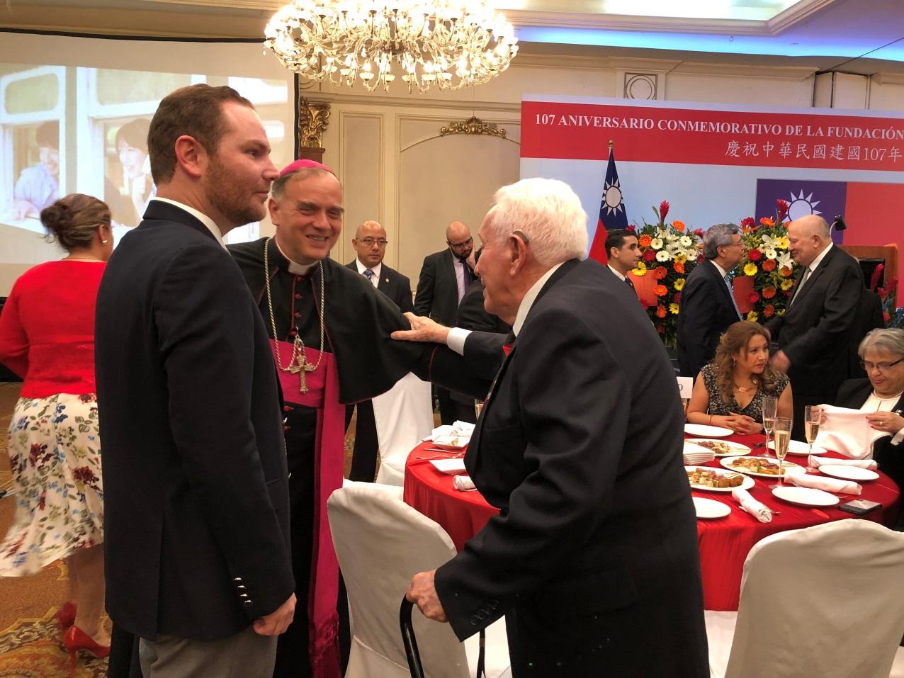 阿爾蘇國會議長、駐瓜使節團團長Nucio Apostólico Nicolas Thevenin及前副總統Roberto Carpio Nicolle(照片前排左至右)出席我國慶酒會