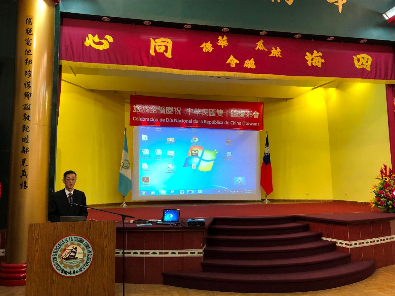 儀式前,賴大使偕各僑團代表向祖先上香致敬,嗣演奏我國與瓜國國歌;由華僑總會陳會長國煒致詞,首先祝賀中華民國國慶,感謝僑胞熱情參與;賴大使致詞表示,感謝與會僑領及僑胞齊聚一堂慶祝中華民國的生日,並欣見旅瓜僑團一片祥和及團結合作,此乃我僑界之福。
