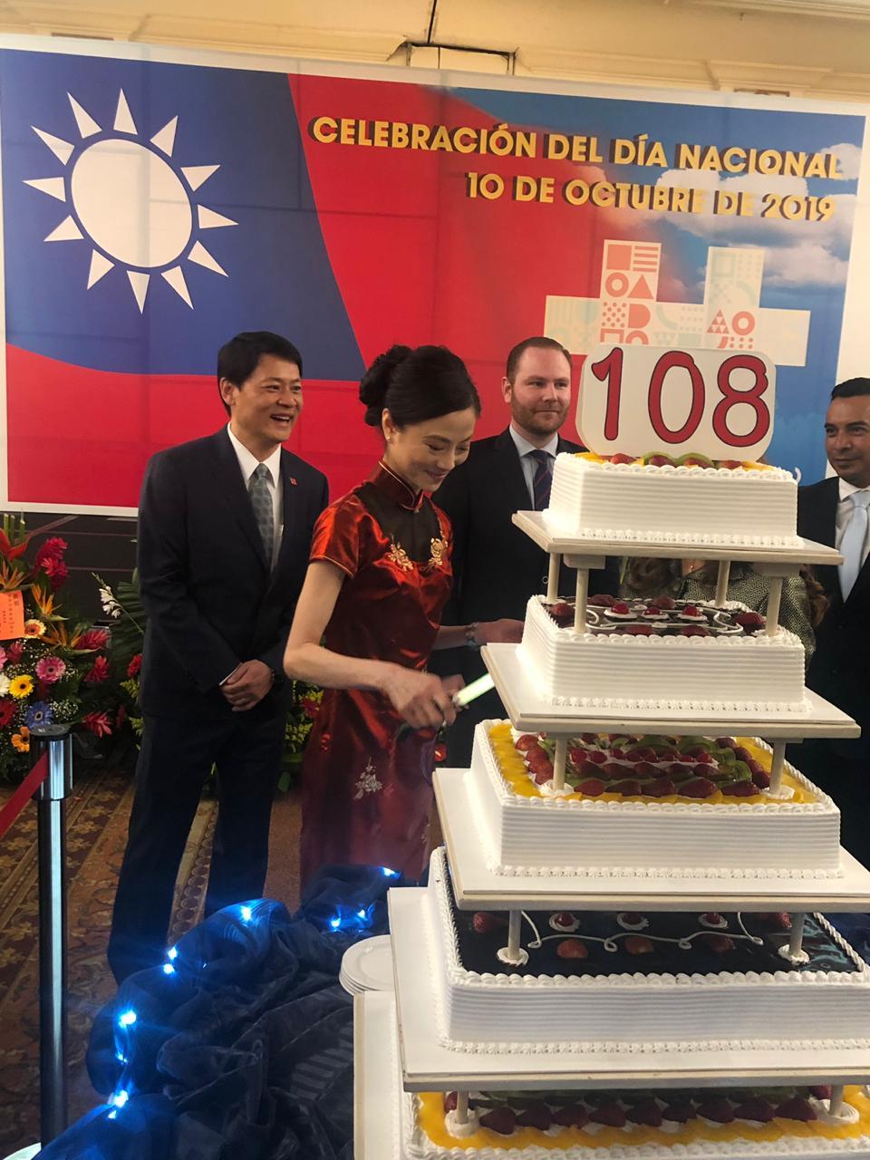 鄭大使夫婦嗣邀請第一夫人瑪洛晶女士、阿爾蘇議長、賈西亞次長及現場嘉賓共同舉杯,互祝國運昌隆,並與會貴賓共切國慶蛋糕。酒會在駐館反覆播放「勇敢自信、世界同行」國慶光碟中進行,充分展現近年來我國在民主政治、自由經濟、安樂社會與多元包容文化各方面充滿活力的現況,現場氣氛熱絡、溫馨且歡愉。
