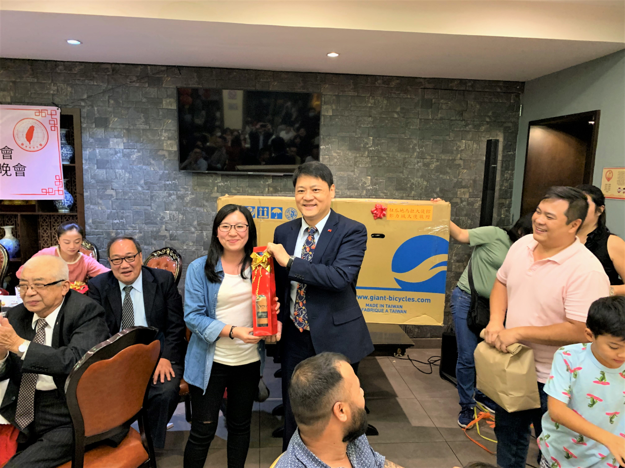 本次活動「臺灣商會」準備並募集豐富的抽獎品,為晚會帶來一波波的歡樂笑聲,駐館特別提供臺灣知名品牌之摺疊腳踏車1部以及紅酒15瓶與僑胞同歡。
