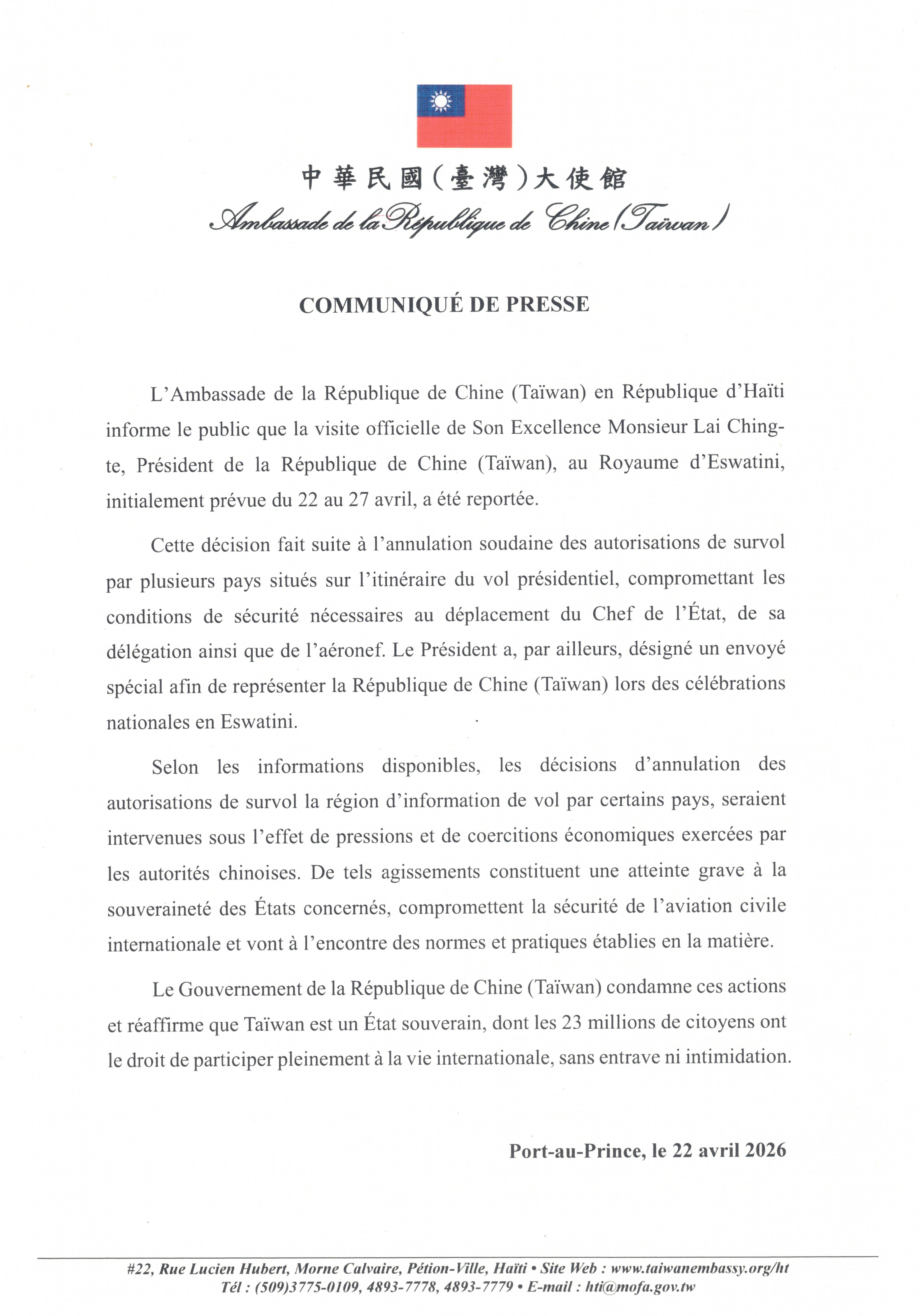 260422_中華民國(台灣)因安全原因推遲總統對史瓦濟蘭的訪問 - 駐海地共和國大使館 Ambassade de la République de Chine (Taïwan) en Haïti ::: 跳到主要內容區塊