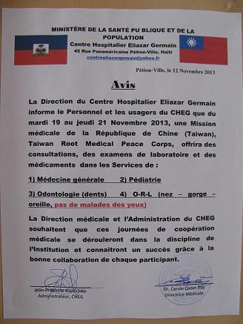 La Mission Médicale de la République de Chine (Taïwan), Taiwan Root Medical Peace Corps, a effectué en Haïti une tournée de consultations bénévoles, réalisées par 27 médecins, infirmières et bénévoles taïwanais, du 18 au 27 novembre 2013 dans les services de Médecine générale, Pédiatrie, Odontologie, et ORL (nez-gorge-oreille) réspectivement au Centre Hospitalier Eliazar Germain de Pétion-Ville et à l’Hôpital Kominote Nicolas Armand de l'Arcahaie.