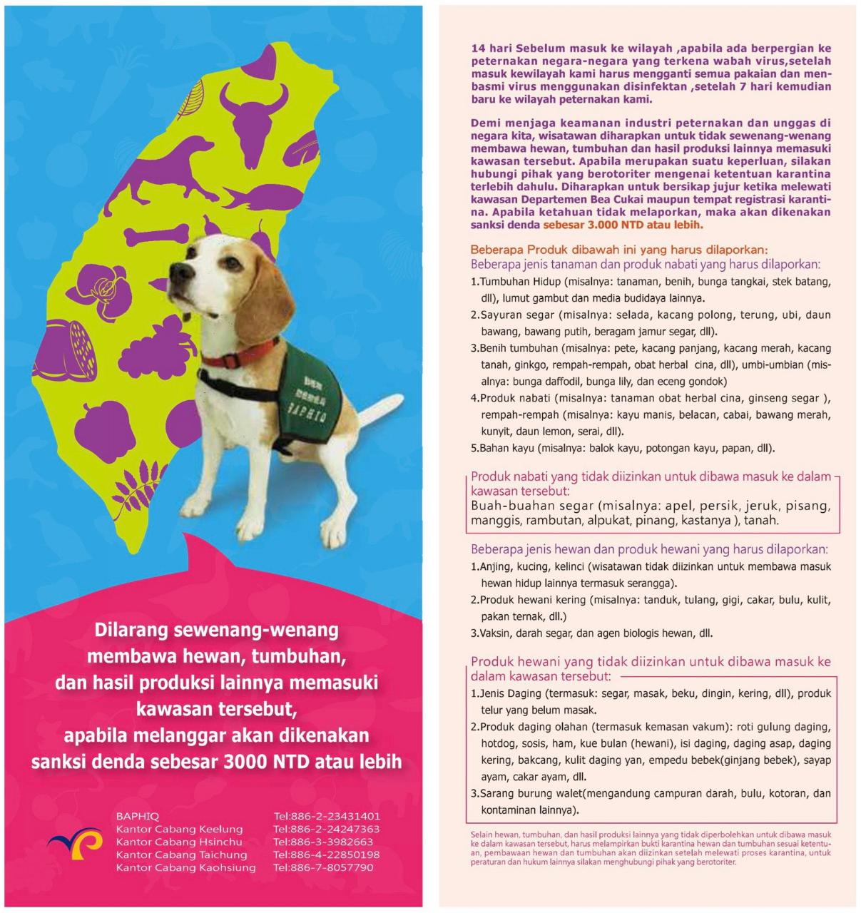 Dilarang membawa hewan, tumbuhan, dan hasil produksi lainnya memasuki Taiwan. Apabila melanggar akan dikenakan sanksi denda lebih dari NTD 3,000. Kalau membawah produks dangin dari daerah epidemi (contohnya Cina), akan dikenakan sanksi denda sebesar NTD 1 juta (kurang-lebih Rp. 470,000,000).