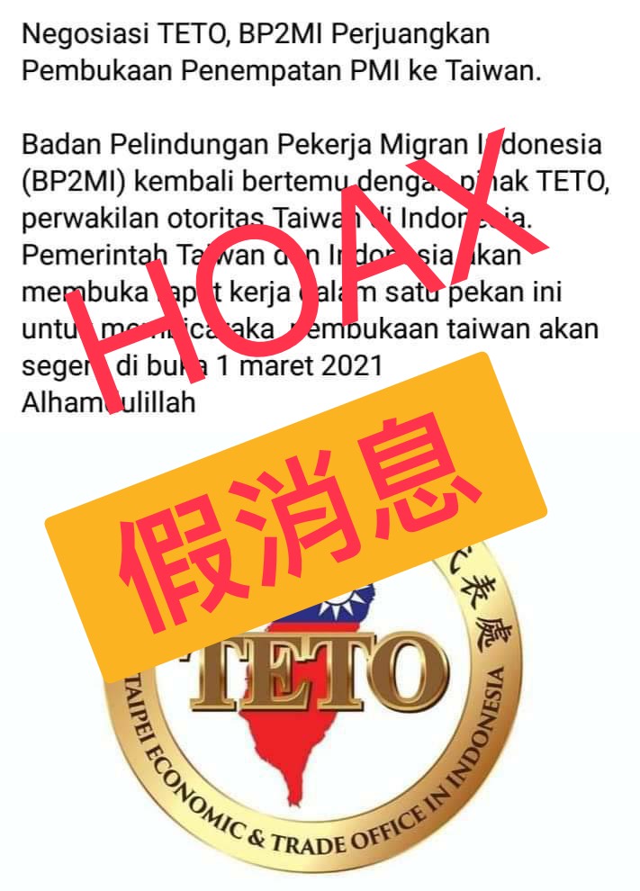 Taipei Economic and Trade Office (TETO) mendapati adanya sekelompok P3MI dan Agensi Taiwan yang telah menggunakan nama dan logo TETO tanpa izin dan persetujuan dari TETO, menyebarkan kabar bahwa pemerintah Taiwan dan pemerintah Indonesia akan mengadakan pertemuan dalam waktu seminggu untuk membahas pembukaan kembali penempatan PMI pada tanggal 1 Maret 2021. Dengan ini, TETO dengan sungguh-sungguh mengklarifikasi bahwa hal ini adalah informasi yang tidak benar, serta meminta agar informasi tersebut segera dihapus dan tidak disebarkan.
