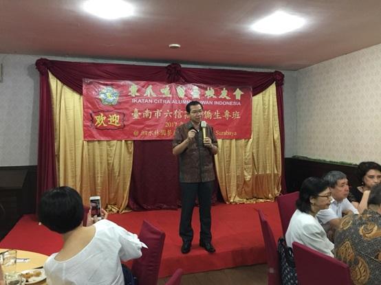 台南市六信高中董事長徐國潤一行訪問泗水辦理僑生專班說明會,首場說明會於11月21日晚假林園餐廳舉行,蕭處長偕同仁出席並應邀致詞,讚許台南六信高中歷史悠久,辦學經驗豐富,並具有位於台南文化古都之優勢;3+4海外僑生技職專班由僑委會補助優質高中創意開設,嘉惠僑界青年子弟,鼓勵僑界廣於推介。