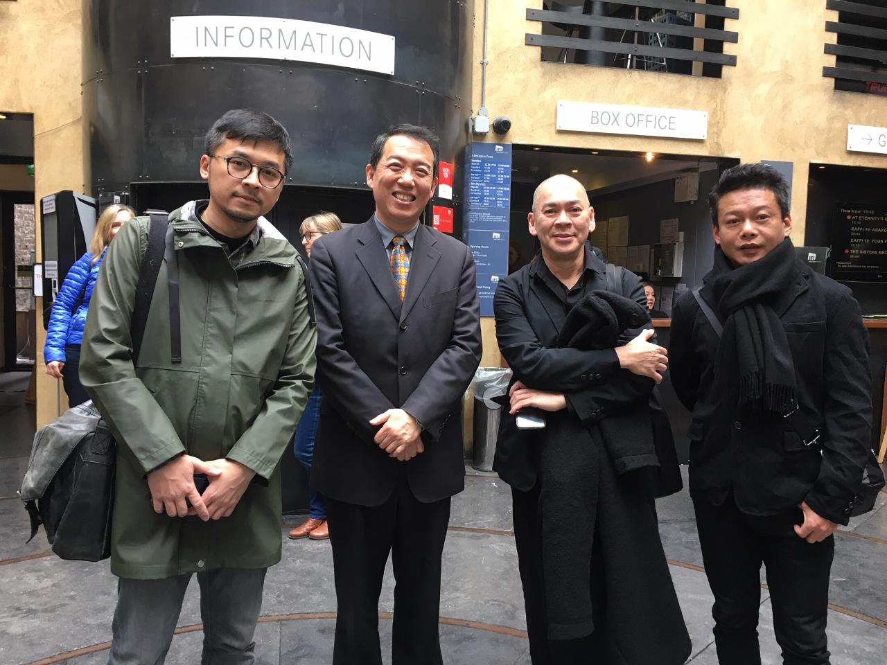 駐愛爾蘭代表處大使楊子葆(左二)與導演蔡明亮(右二)、影帝李康生(右一)及製片王雲霖 (左一)合影。
