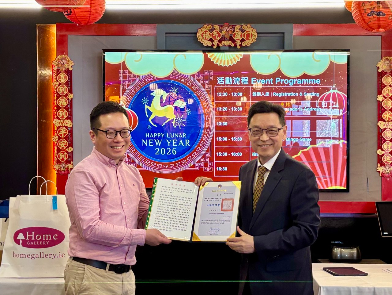 唐大使致詞時首先感謝「愛爾蘭台灣協會」用心籌辦活動,讓在愛爾蘭生活的台灣朋友們感受年節溫暖,也讓當地朋友有機會體驗台灣年味。唐大使並藉此歡聚場合,轉致僑務委員會徐佳青委員長頒予僑務顧問劉淑慧,以及僑務促進委員暨愛台協會會長林聖諭的聘書與賀函,期許台灣在愛社群持續透過多元活動交流互助,深化台愛人民之間的認識與情誼。唐大使最後也祝福大家新年快樂、安康如意。