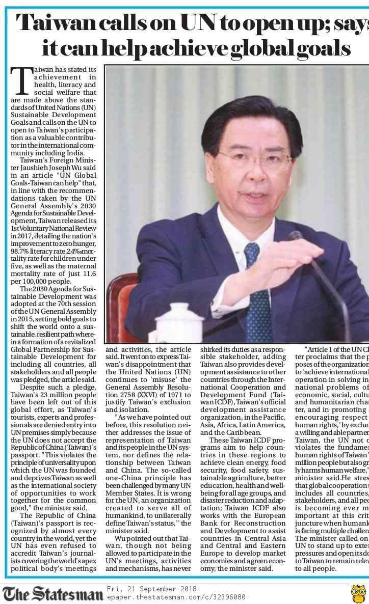 On Sept. 21, 2018, one of India’s most prestigious newspaper The Statesman carried an article “UN Global Goals- Taiwan can help,” written by Jaushieh Joseph Wu, Minister of Foreign Affairs, Republic of China (Taiwan) about Taiwan’s achievements and commitments to the Sustainable Development Goals as outlined in United Nations General Assembly 2030 Agenda.