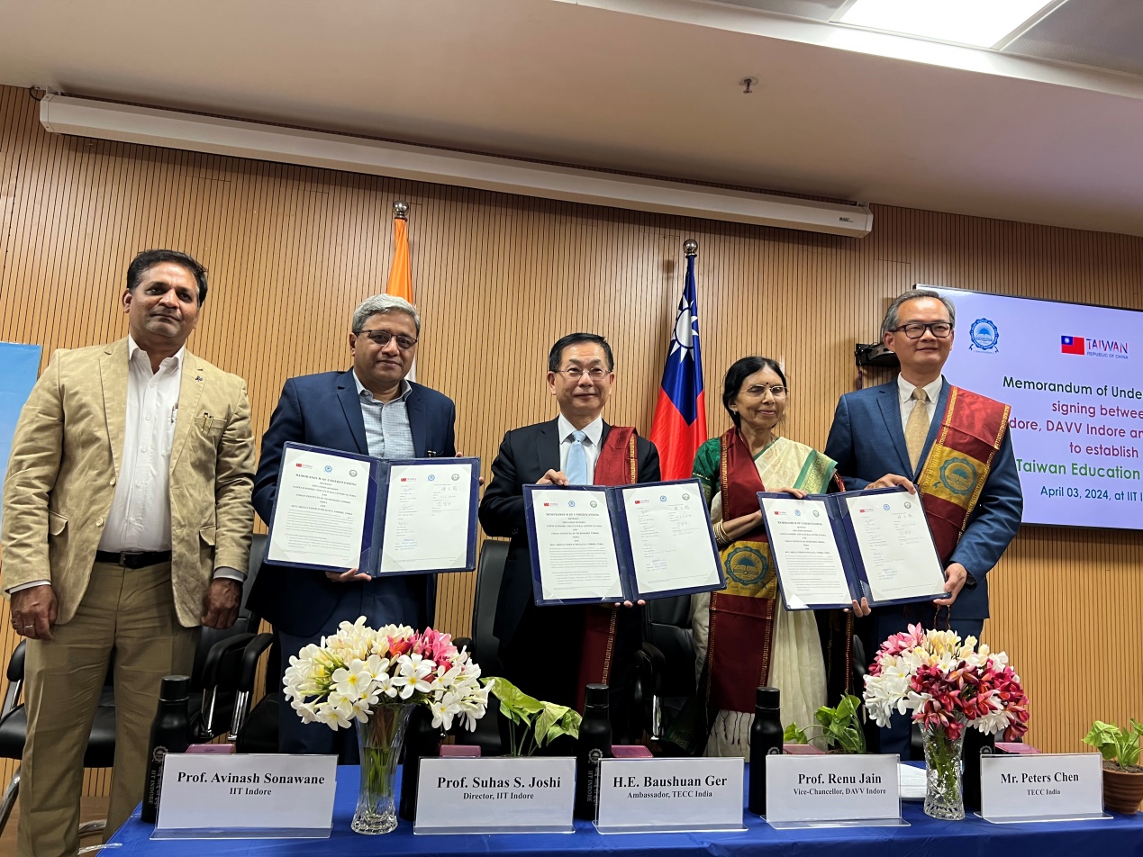Mr. Peters Chen, Education Director of the TECC has signed MoU with Prof Suhas S. Joshi, Director of IIT Indore and Prof. Renu Jain, Vice Chancellor of Devi Ahilya Vishwavidyalaya (DAVV) to establish “Taiwan Education Centre” (TEC). Under this MoU, Taiwanese Mandarin teacher will teach on campus and bridge bilateral education and cultural exchanges. This is the first TEC in Madhya Pradesh and the 33rd all over India.