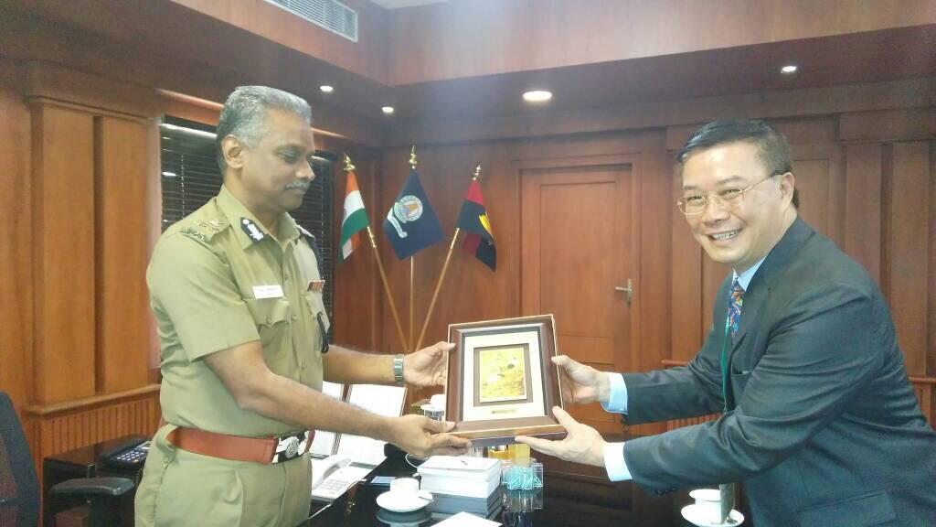 駐清奈辦事處李朝成處長(右)致贈紀念品予大清奈警察署長) A. K. Viswanatha(左)