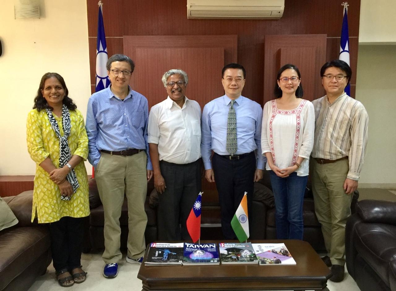 馬德拉斯大學政治暨公共行政系系主任安沐教授(Professor Ramu Manivannan)夫婦陪同來訪之國立臺灣大學新聞所陳家帶兼任講師、中央大學及世新大學戎培芬兼任講師、國家交響樂團小提琴師李京熹先生1月24日下午拜會駐清奈辦事處李朝成處長,就促進雙邊民間文化、教育與音樂交流活動交換意見。