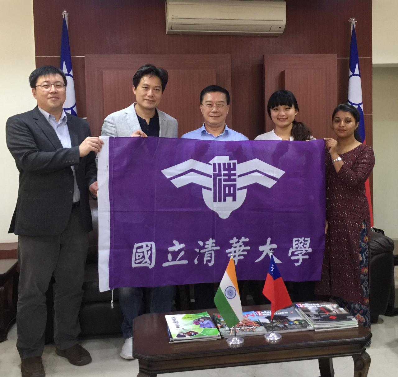 駐清奈辦事處李朝成處長(中)與國立清華大學全球長、材料科學與工程學系(所)嚴大任教授(左二)、通訊工程研究所所長洪樂文教授(左一)、材料科學與工程學系(所)博士後研究員Pavithra Sriram(右一)、專案經理陳安琪(右二)合影。