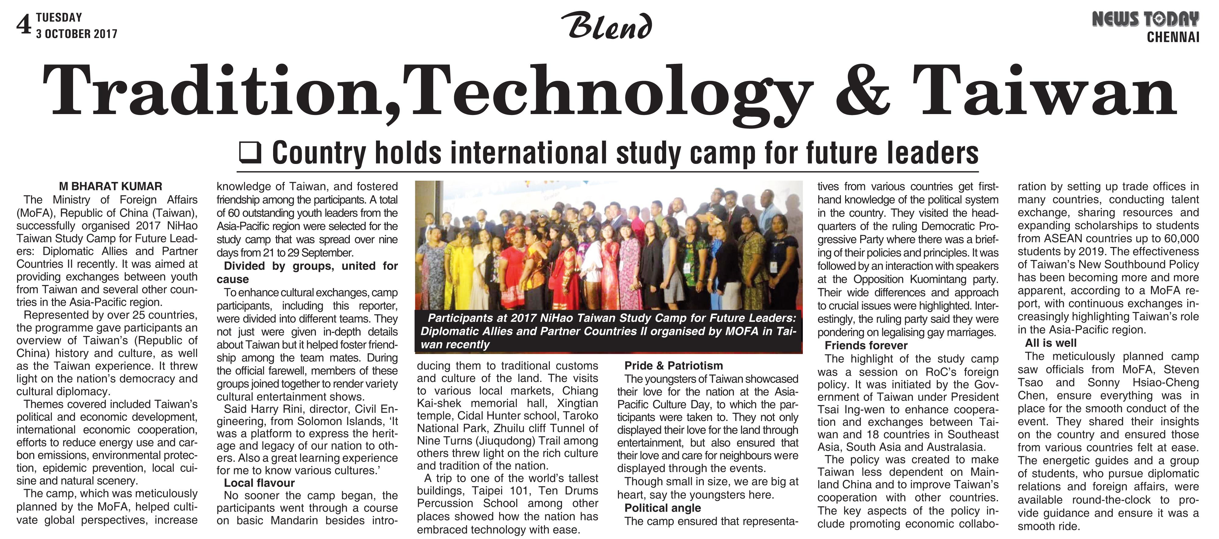 "Blend Tradition, Technology & Taiwan" and "They love & respect nature, Taiwanese passionate about their culture & history" by Mr. Bharath Kumar, published by News Today on 3rd and 4th Oct, 2017.