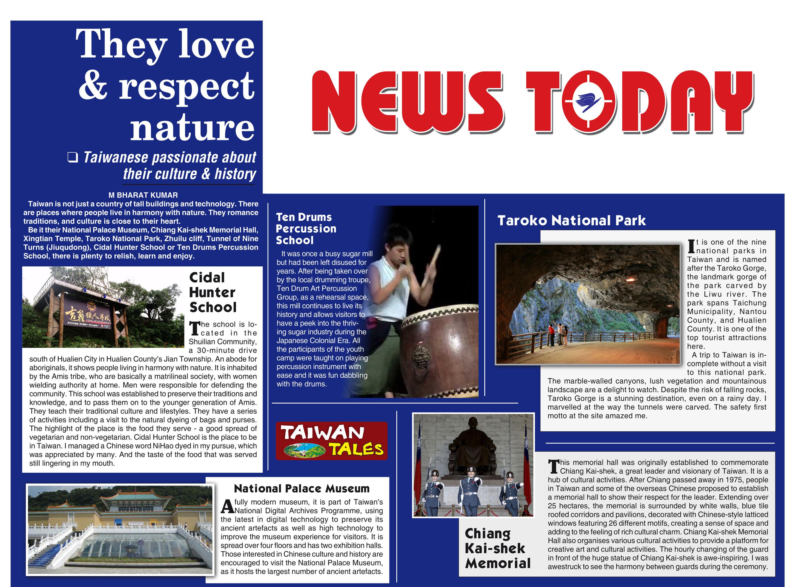 "Blend Tradition, Technology & Taiwan" and "They love & respect nature, Taiwanese passionate about their culture & history" by Mr. Bharath Kumar, News Today