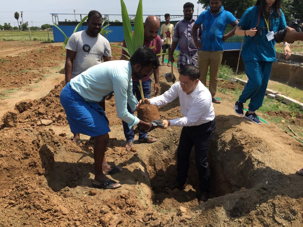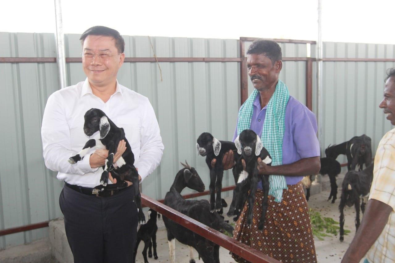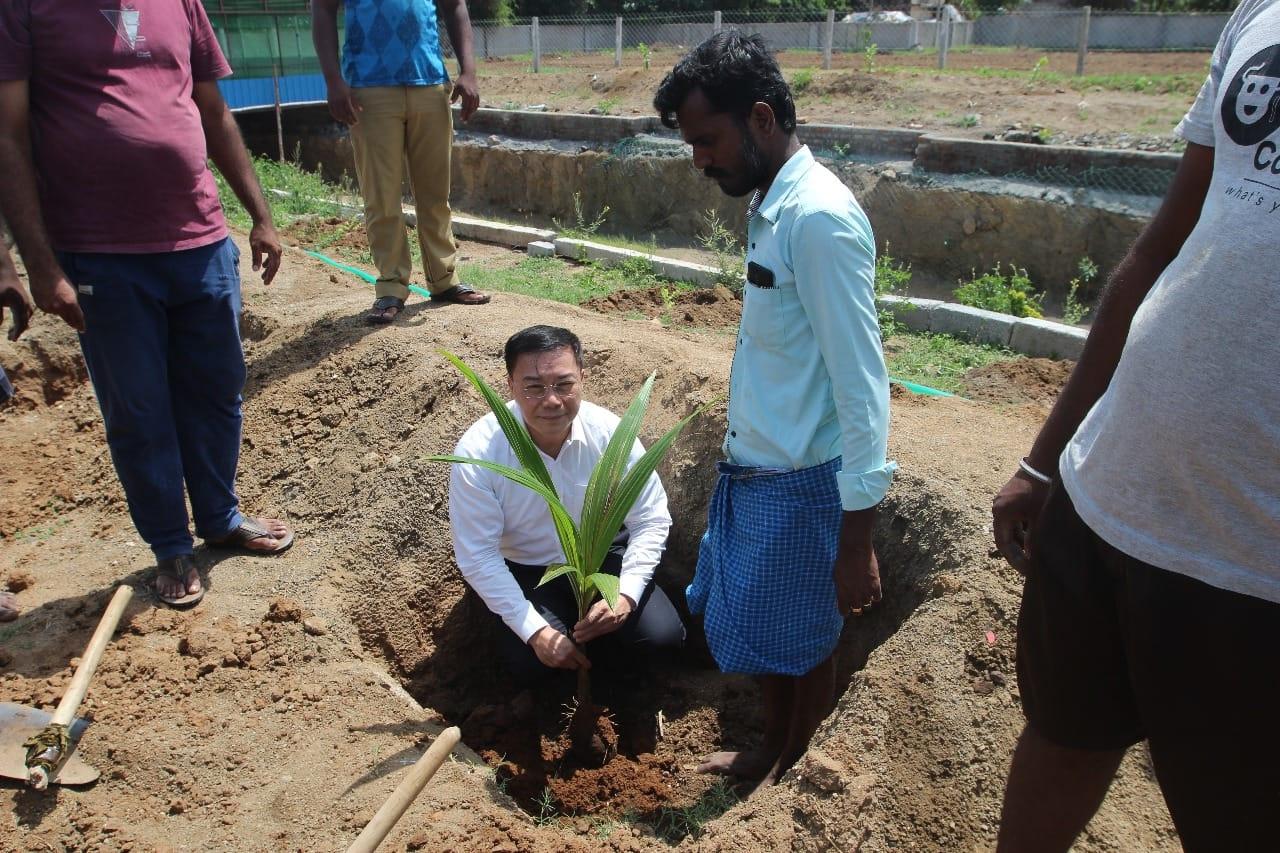 Director-General Charles Li of TECC in Chennai paid a visit to the newly-developed Integrated Farm at Ammaiyappanallur, near Kanchipuram, planting a coconut tree, at the invitation of the Seek Foundation and also to tour some of its projects taking place at school and products from the sowing class.