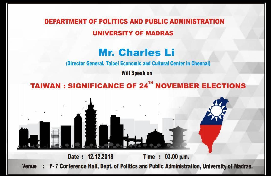 Director-General of TECC in Chennai, Mr. Charles Li was invited by Professor Ramu Manivannan, Head of the Department of Politics and Public Administration at University of Madras, to deliver a special speech on “The significance of Taiwan mayoral elections 2018”, at the Department on December 12th,2018.