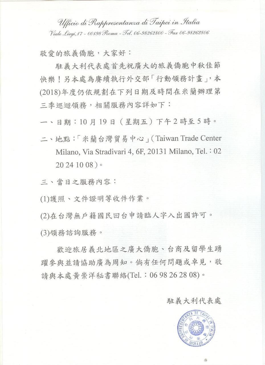 本處訂於107年10月19日在米蘭辦理行動領務 - 駐義大利台北代表處 Ufficio di Rappresentanza di Taipei in Italia ::: 跳到主要內容區塊