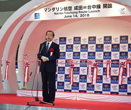 台北駐日經濟文化代表處代表謝長廷於6月14日出席在成田機場所舉行華信航空台中直飛成田班機首航儀式。謝代表於致詞時表示,台中成田直航班機每週飛航七班,期盼啟航後能帶動台日雙方旅客的成長,日本旅客可搭乘此航班前往台中參觀今年在台中所舉行的「2018台中世界花卉博覽會」。