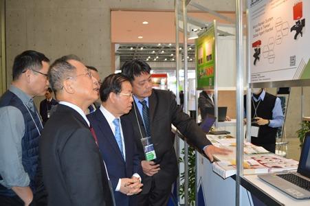 謝代表(左2)參觀台灣館各展位,聽取出展者的說明