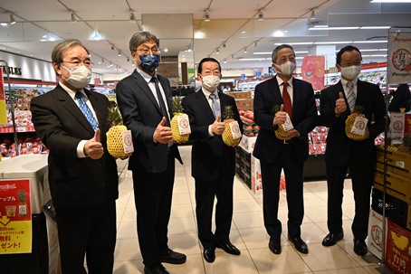 駐日代表謝長廷於東京都內超市行銷臺灣鳳梨。